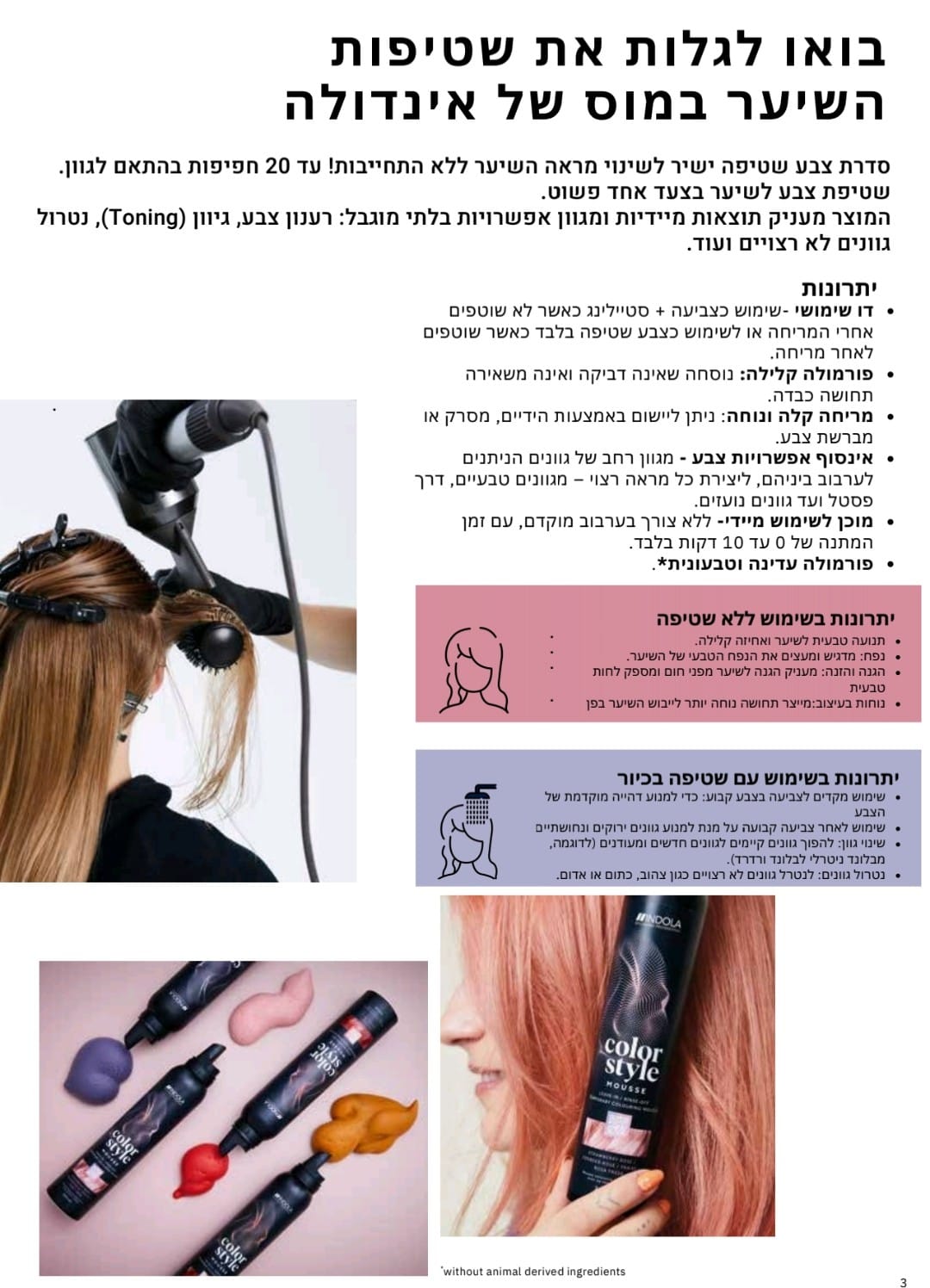 המוס לשיער Indola Color Style Mousse הוא מוצר עיצוב וצביעה זמנית "2 ב-1" המיועד לריענון גוון, נטרול תתי-גוון לא רצויים והוספת נפח. המוצר מגיע במיכל של 200 מ"ל, אינו מכיל אמוניה ומתאים לשימוש ביתי או מקצועי ללא צורך בערבוב עם חמצן.