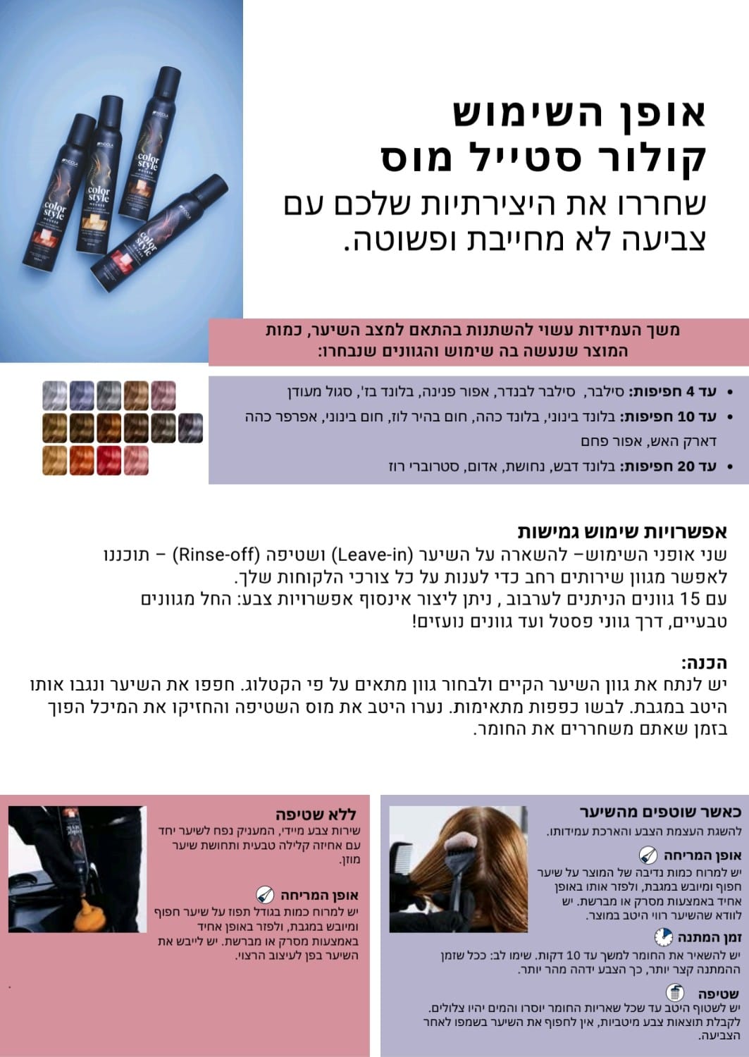• צביעה ללא התחייבות: הצבע דוהה בהדרגה עם החפיפות (לרוב תוך 4-20 חפיפות, תלוי בגוון).