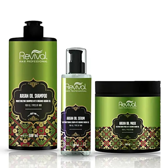 ״סדרת שמן ארגן Revival Argan היוקרתית. ערכה המכילה שמפו, מסכה וסרום.