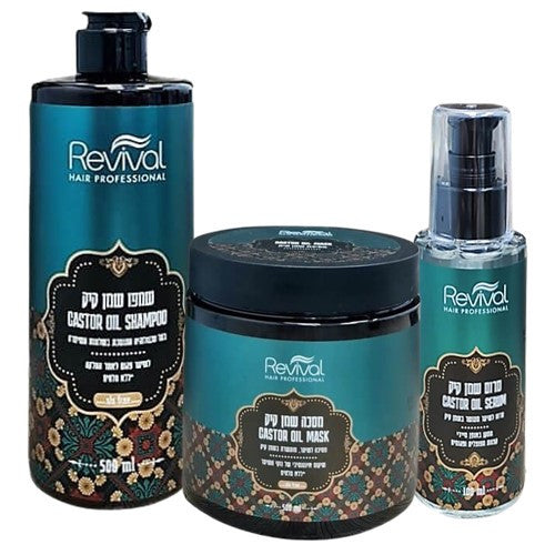 ״מארז סדרה טיפולית שמן קיק Revival היוקרתית המכילה שמפו, מסכה וסרום.